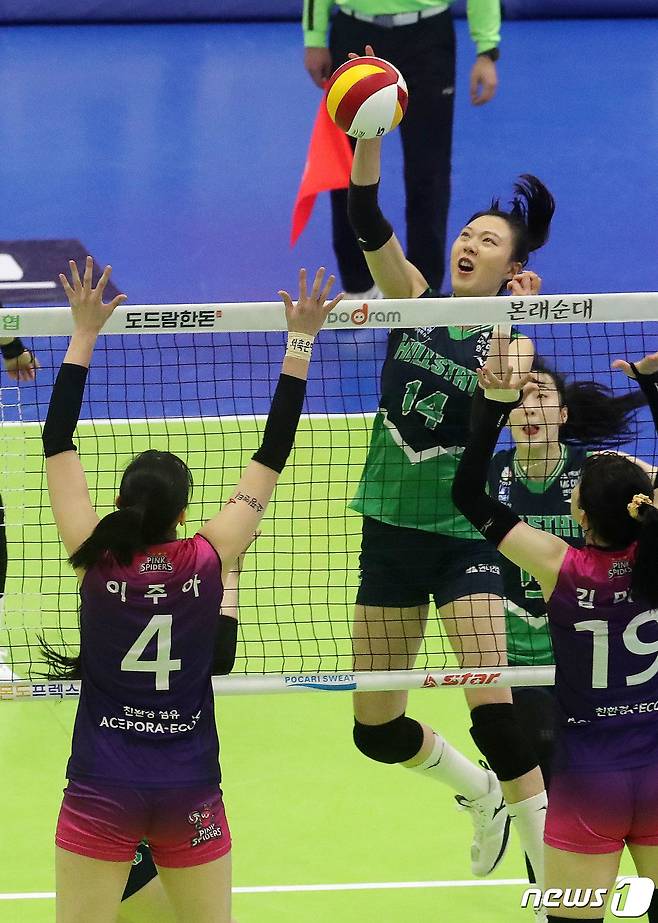 (수원=뉴스1) 박세연 기자 = 7일 오후 경기 수원시 장안구 수원실내체육관에서 열린 열린 프로배구 '도드람 2022-2023 V-리그' 여자부 현대건설과 흥국생명의 경기에서 양효진(현대건설)이 공격을 하고 있다. 2023.2.7/뉴스1