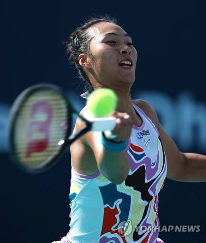 epa10452342 Qinwen Zheng of China hits a forehand in her match against Rebecca Marino of Canada at the WTA Abu Dhabi Open in Abu Dhabi, United Arab Emirates, 07 February 2023. EPA/ALI HAIDER