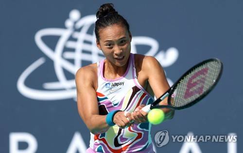 epa10452343 Qinwen Zheng of China hits a backhand in her match against Rebecca Marino of Canada at the WTA Abu Dhabi Open in Abu Dhabi, United Arab Emirates, 07 February 2023. EPA/ALI HAIDER