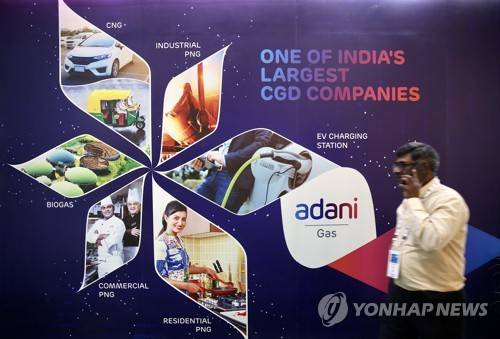 epa10452352 A man walks in front of the Adani Gas billboard at an exhibition stall during the day two of 'India Energy Week 2023' in Bangalore, India, 07 February 2023. The India Energy Week (IEW) aims to showcase the country's rising prowess as an energy transition powerhouse and Prime Minister Narendra Modi's pledge at COP26 to cut India's emissions to net-zero by 2070. The three-day event will run from 06 to 08 February 2023. EPA/JAGADEESH NV