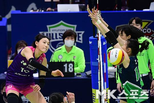 흥국생명 김연경이 상대 블로커를 앞에 두고 스파이크를 날리고 있다.