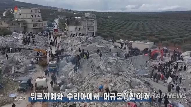 (서울=연합뉴스) 조선중앙TV는 튀르키예 동남부에서 대형 지진이 발생한 지 하루 만인 7일 저녁 뉴스에서 관련 소식을 발 빠르게 보도했다. 북한 관영매체는 보통 주요 국제뉴스를 수일간의 시차를 두고 보도한다. 북한 모든 주민들이 시청하는 대내용 매체인 중앙TV가 이번 소식을 비교적 신속히 보도한 것은 수천 명의 인명 피해를 낳은 참사에 대한 북한의 관심을 보여주는 것으로 풀이된다. [조선중앙TV 화면] 2023.2.7