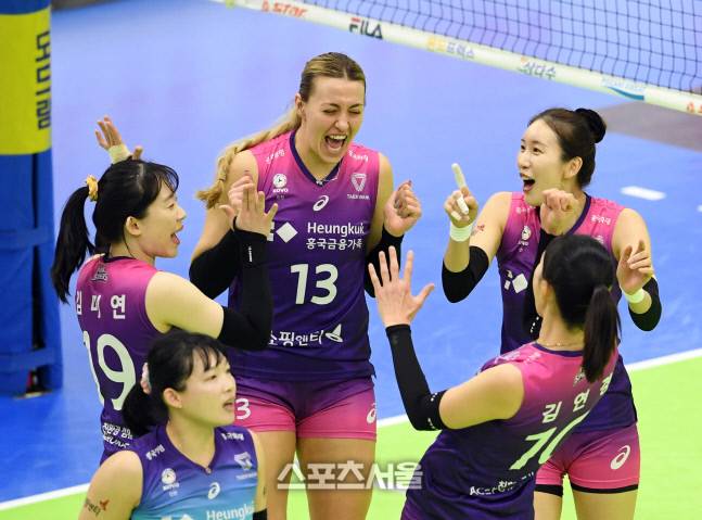 흥국생명 선수들이 7일 수원체육관에서 열린 2022-2023 V리그 현대건설과의 경기에서 득점을 한 뒤 함께 기뻐하고 있다. 2023. 2. 7.
