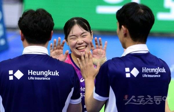 7일 경기도 수원실내체육관에서 ‘2022-2023 도드람 V리그’ 수원 현대건설과 인천 흥국생명의 여자부 경기가 열렸다. 흥국생명이 현대건설을 상대로 세트스코어 3-0으로 승리한 후 이원정이 환한 미소를 짓고 있다.