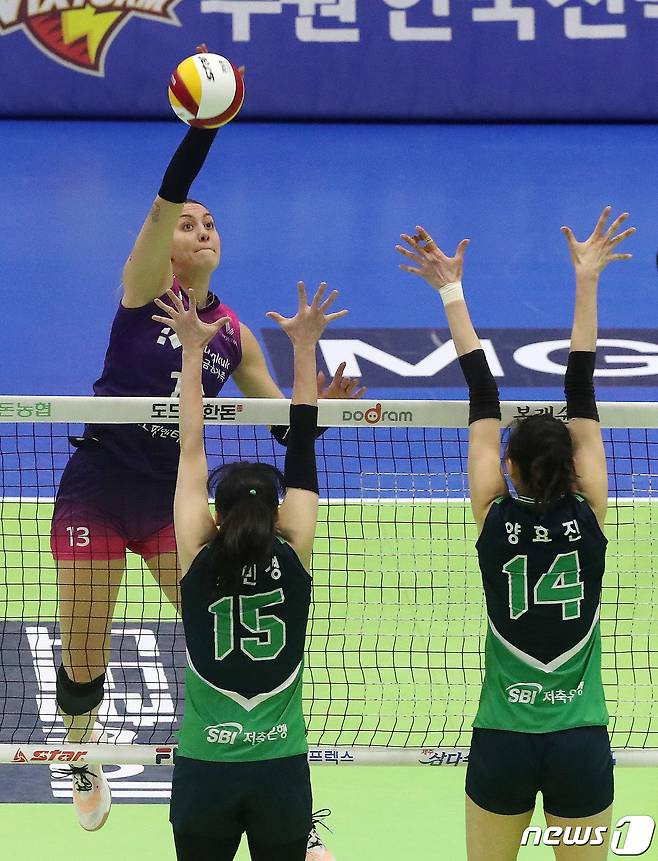(수원=뉴스1) 박세연 기자 = 7일 오후 경기 수원시 장안구 수원실내체육관에서 열린 열린 프로배구 '도드람 2022-2023 V-리그' 여자부 현대건설과 흥국생명의 경기에서 옐레나(흥국생명)가 공격을 하고 있다. 2023.2.7/뉴스1