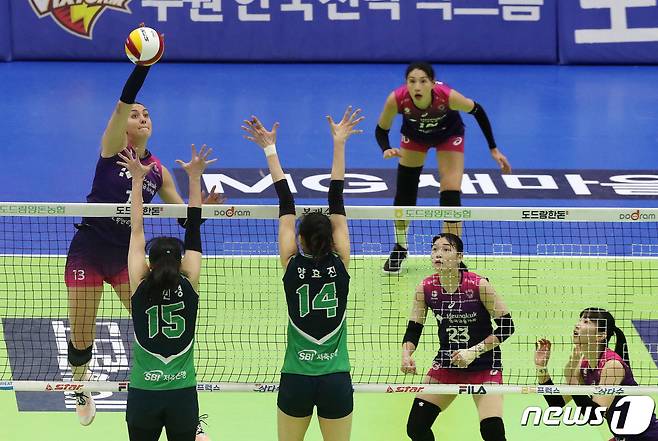 (수원=뉴스1) 박세연 기자 = 7일 오후 경기 수원시 장안구 수원실내체육관에서 열린 열린 프로배구 '도드람 2022-2023 V-리그' 여자부 현대건설과 흥국생명의 경기에서 옐레나(흥국생명)가 공격을 하고 있다. 2023.2.7/뉴스1