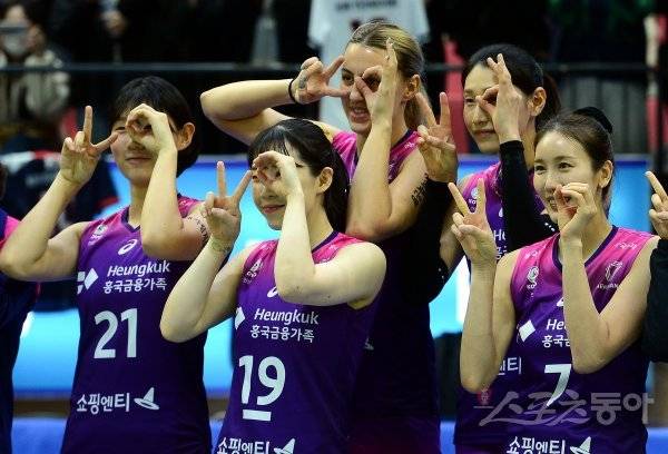 7일 경기도 수원실내체육관에서 ‘2022-2023 도드람 V리그’ 수원 현대건설과 인천 흥국생명의 여자부 경기가 열렸다. 흥국생명이 현대건설을 상대로 세트스코어 3-0으로 승리한 후 김연경과 옐레나가 기념촬영을 하고 있다.