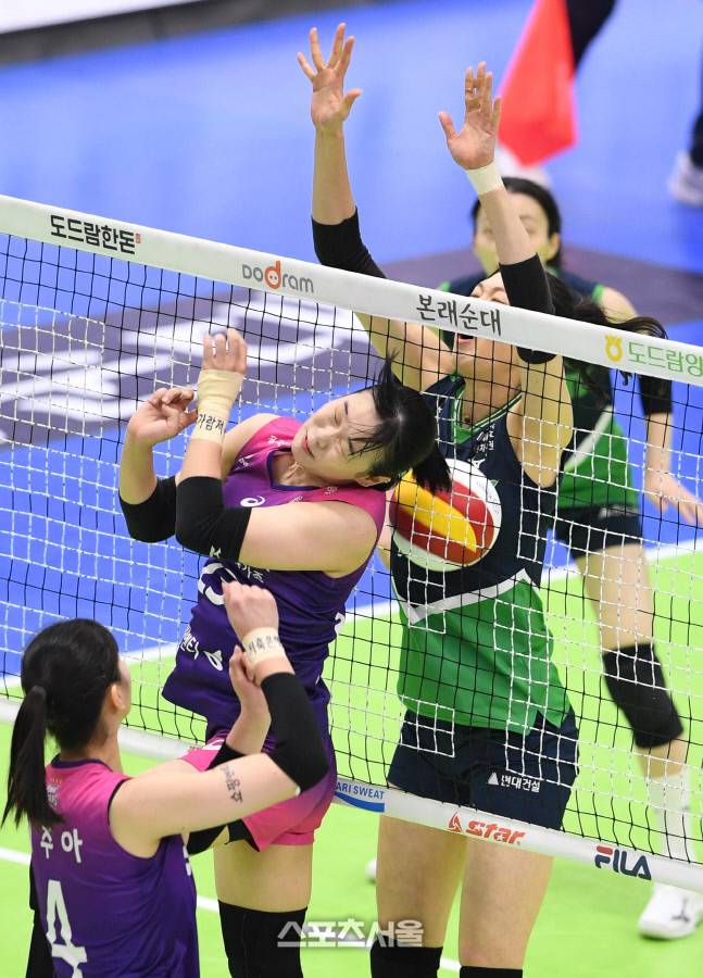 흥국생명 이원정(왼쪽)이 7일 수원체육관에서 열린 2022-2023 V리그 현대건설과의 경기에서 네트 위로 토스를 하려다 손을 빼면서 현대건설 양효진 앞으로 공이 떨어지고 있다. 2023. 2. 7.
