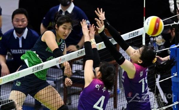 7일 경기도 수원실내체육관에서 ‘2022-2023 도드람 V리그’ 수원 현대건설과 인천 흥국생명의 여자부 경기가 열렸다. 현대건설 정지윤이 흥국생명 블로커를 피해 스파이크를 날리고 있다.