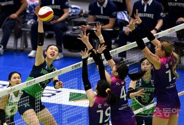 7일 경기도 수원실내체육관에서 ‘2022-2023 도드람 V리그’ 수원 현대건설과 인천 흥국생명의 여자부 경기가 열렸다. 현대건설 양효진이 흥국생명 블로커를 피해 공격을 펼치고 있다.