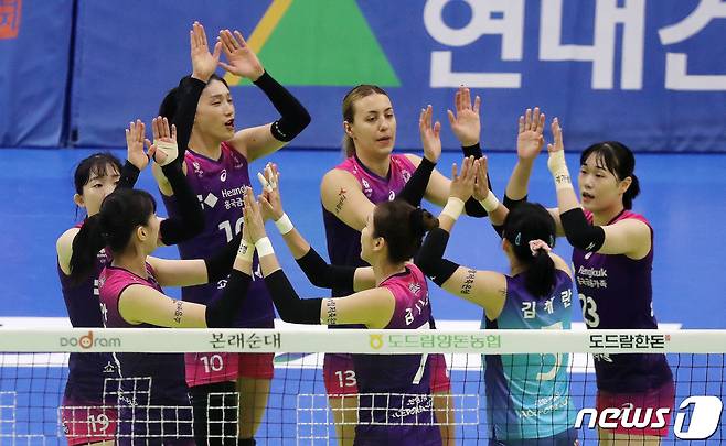 (수원=뉴스1) 박세연 기자 = 7일 오후 경기 수원시 장안구 수원실내체육관에서 열린 열린 프로배구 '도드람 2022-2023 V-리그' 여자부 현대건설과 흥국생명의 경기에서 흥국생명 선수들이 득점 성공 후 환호하고 있다. 2023.2.7/뉴스1