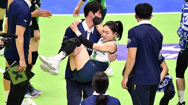 25대 26에서 주전 리베로 김연견이 공을 거둬 올리는 과정에서 디딤발인 오른쪽 발을 접질리며 그대로 쓰러졌습니다.