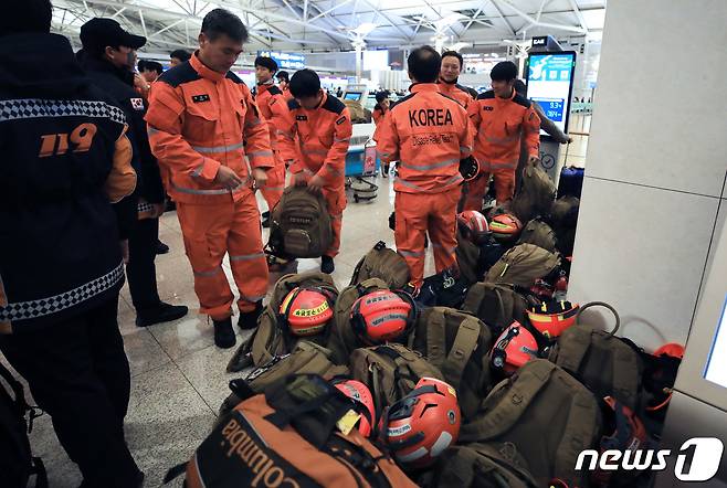 (인천공항=뉴스1) 구윤성 기자 = 튀르키예 지진 실종자 수색 등을 위한 대한민국 긴급구호대(KDRT) 대원들이 7일 오후 출국을 위해 인천국제공항 제1여객터미널에 집결해 짐을 챙기고 있다.