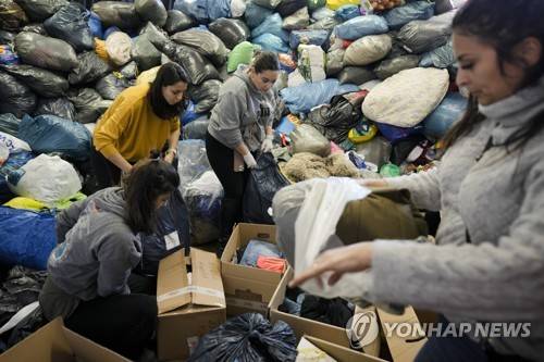 People sort and pack relief supplies at a collection point of the Turkish community in Berlin, Germany, Tuesday, Feb. 7, 2023. Hundreds of members of Berlin's Turkish community flocked to a music school in the German capital to donate essential humanitarian supplies after southern Turkey and northern Syria were hit by double earthquakes on Monday, Feb. 6, 2023. (AP Photo/Markus Schreiber)