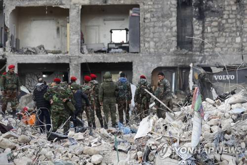 Russian soldiers and Syrian security forces inspect the wreckage of collapsed buildings, in Aleppo, Syria, Tuesday, Feb. 7, 2023. Rescuers raced Tuesday to find survivors in the rubble of thousands of buildings brought down by a powerful earthquake and multiple aftershocks that struck eastern Turkey and neighboring Syria. (AP Photo/Omar Sanadiki)