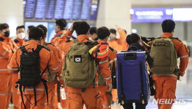 [인천공항=뉴시스] 김선웅 기자 = 7일 오후 인천국제공항에서튀르키예 지진 수색 및 구조를 위한 대한민국 긴급구호대원들이 공항에 도착하고 있다. 2023.02.07. mangusta@newsis.com