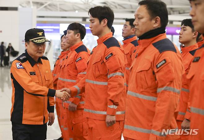 [인천공항=뉴시스] 김선웅 기자 = 남화영 소방청장 직무대행이 7일 인천국제공항에서 지진 수색 및 구조를 위해 튀르키예로 향하는 긴급구호대 대원들을 격려하고 있다. 2023.02.07. mangusta@newsis.com
