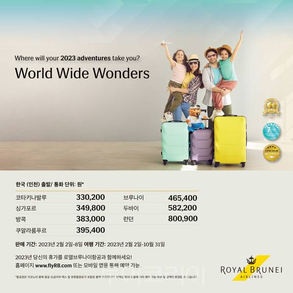 오는 8일까지이며, 로열브루나이항공 공식 홈페이지에서 구매할 수 있다. 특가항공권 여행 기간은 오는 10월 31일까지다.