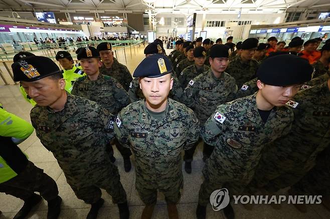 (영종도=연합뉴스) 김도훈 기자 = 튀르키예 지진 실종자 수색 등을 위한 대한민국 긴급구호대(KDRT)에 파견된 특전사 장병들이 7일 오후 인천국제공항 제1여객터미널에서 출정식을 기다리고 있다.