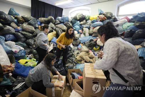 People sort and pack relief supplies in a packed room at a collection point of the Turkish community in Berlin, Germany, Tuesday, Feb. 7, 2023. Hundreds of members of Berlin's Turkish community flocked to a music school in the German capital to donate essential humanitarian supplies after the devastating earthquake that struck Turkey and Syria on Monday. (AP Photo/Markus Schreiber)