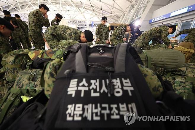 (영종도=연합뉴스) 김도훈 기자 = 튀르키예 지진 실종자 수색 등을 위한 대한민국 긴급구호대(KDRT) 대원들이 7일 오후 인천국제공항 제1여객터미널에서 출국에 앞서 짐 정리를 하고 있다.