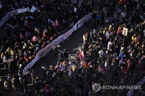 Protesters march during a demonstration against plans to push back France's retirement age, Tuesday, Feb. 7, 2023 in Paris. The demonstration comes a day after French lawmakers began debating a pension bill that would raise the minimum retirement from 62 to 64. The bill is the flagship legislation of President Emmanuel Macron's second term. (AP Photo/Thibault Camus)