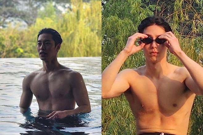 공개된 사진 속 이재욱은 식스팩을 자랑하며 신승호와 함께 수영을 즐기고 있다.