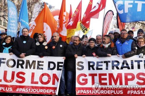 epa10452719 Philippe Martinez (CR), General Secretary of the General Confederation of Labor CGT, and Laurent Berger (CL), Secretary General of the French Democratic Confederation of Labour (CFDT), Confederal president of the CFE-CGC, Frederic Souillot, (3-R) General Secretary of FO, flanked by other union leaders, take part in a rally against the French government's planned reform of the pension system, in Paris, France, 07 February 2023. The French government plans to raise the minimum retirement age from 62 to 64 by 2030. EPA/TERESA SUAREZ