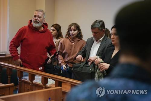 Nobel Peace Prize awarded journalist Dmitry Muratov, editor-in-chief of the influential Russian newspaper Novaya Gazeta, left, surrounded by journalists leaves a courtroom of the Moscow City Court after the delivering of a ruling on Novaya Gazeta's appeal against an earlier verdict, in Moscow, Russia, Tuesday, Feb. 7, 2023. The Moscow City Court upheld an earlier verdict to revoke the license of Novaya Gazeta, a top independent newspaper that has been critical of the Kremlin for years. (AP Photo/Alexander Zemlianichenko)