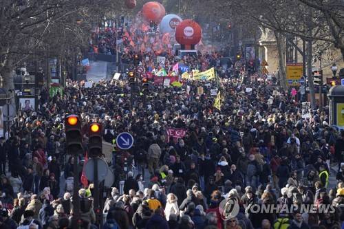 Protesters march during a demonstration against plans to push back France's retirement age, Tuesday, Feb. 7, 2023 in Paris. The demonstration comes a day after French lawmakers began debating a pension bill that would raise the minimum retirement from 62 to 64. The bill is the flagship legislation of President Emmanuel Macron's second term. (AP Photo/Michel Euler)