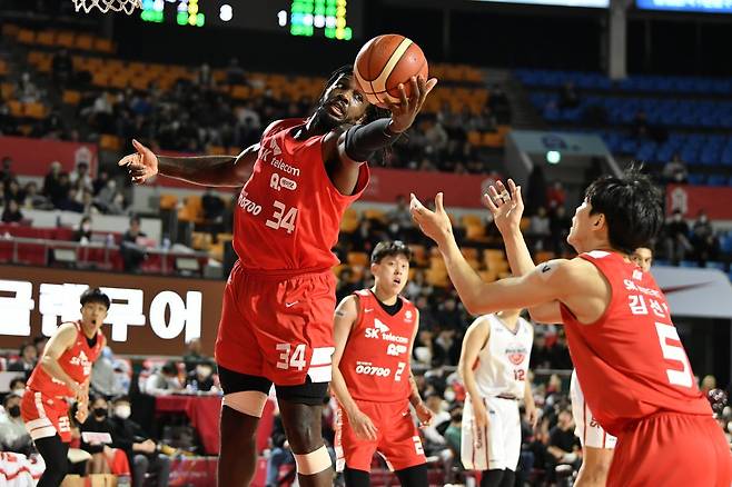(서울=연합뉴스) 7일 서울 잠실학생체육관에서 열린 2022-2023 SKT 에이닷 프로농구 정규리그 울산 현대모비스와 서울 SK의 경기에서 SK 워니가 리바운드 볼을 잡고 있다. 2023.2.7 [KBL 제공. 재판매 및 DB 금지]