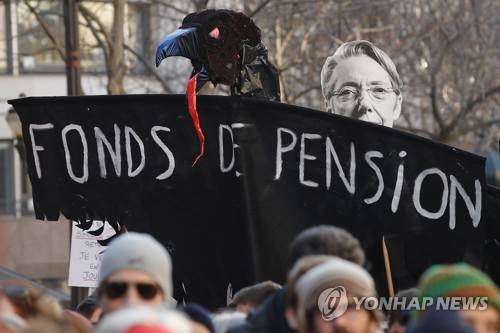 epa10452763 A protester holds a placard reading 'Pension fund' during a demonstration against the government's plan to reform the pension system in Paris, France, 07 February 2023. The French government plans to raise the minimum retirement age from 62 to 64 by 2030. EPA/TERESA SUAREZ