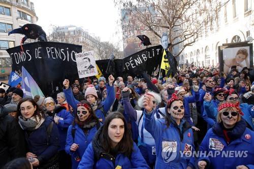 epa10452768 Les Rosies Group, wearing headband of Rosie the Rieveter, demonstrate against the planned pension reform, in Paris, France, 07 February 2023. The French government plans to raise the minimum retirement age from 62 to 64 by 2030. EPA/TERESA SUAREZ