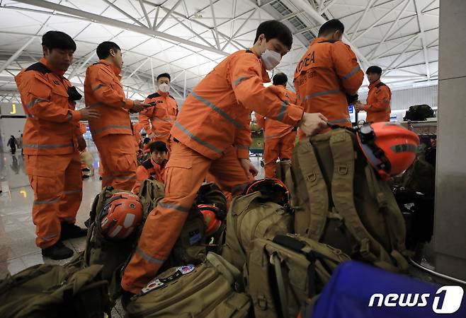 (인천공항=뉴스1) 구윤성 기자 = 튀르키예 지진 실종자 수색 등을 위한 대한민국 긴급구호대(KDRT) 대원이 7일 오후 인천국제공항 제1여객터미널에서 출국을 앞두고 짐을 정돈하고 있다. 정부는 외교부와 소방청·코이카(KOICA·한국국제협력단) 등 관계자 60여명, 육군특수전사령부 병력 50명 등으로 구성된 긴급구호대를 튀르키예로 파견한다. 2023.2.7/뉴스1
