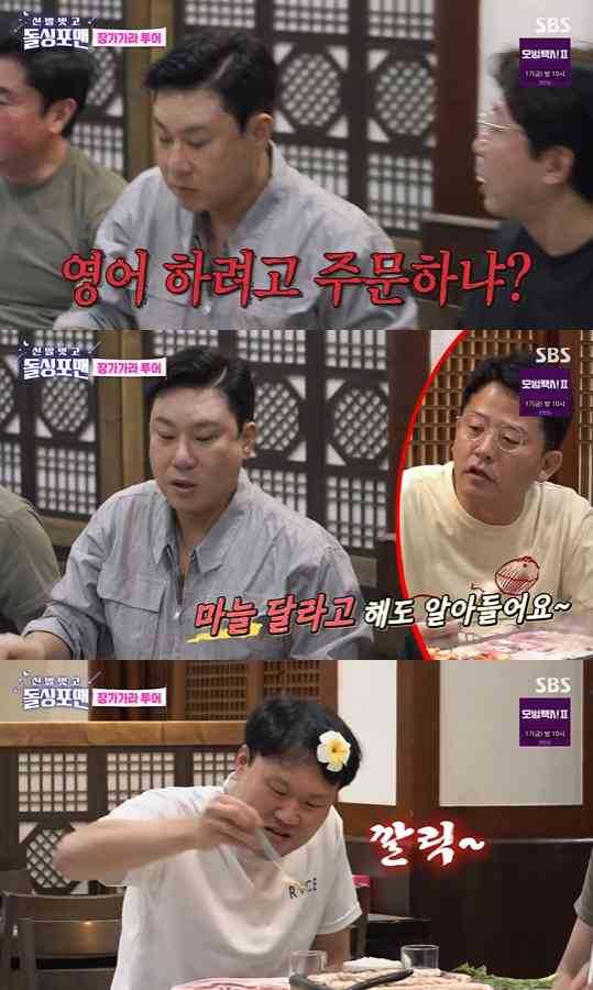 그 때 갑자기 이상민이 영어로 "마늘을 좀 달라"고 발음을 굴려 주문했고, 이에 탁재훈은 "너는 영어쓰려고 주문하니?"라고 타박했다.