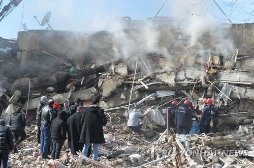 epa10452799 Emergency personnel search for victims at the site of a collapsed building after a powerful earthquake in the center of Kahramanmaras city, southeastern Turkey, 07 February 2023. More than 4,000 people were killed and thousands more injured after a major 7.8 magnitude earthquake struck southern Turkey and northern Syria on 06 February. Authorities fear the death toll will keep climbing as rescuers look for survivors across the region. EPA/NECATI SAVAS
