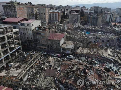 epa10452821 An aerial photo taken with a drone shows collapsed buildings in the aftermath of a powerful earthquake in the center of Kahramanmaras, southeastern Turkey, 07 February 2023. More than 4,000 people were killed and thousands more injured after a major 7.8 magnitude earthquake struck southern Turkey and northern Syria on 06 February. Authorities fear the death toll will keep climbing as rescuers look for survivors across the region. EPA/NECATI SAVAS