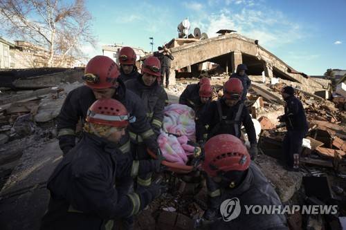 Rescue teams evacuate a survivor from the rubble of a destroyed building in Kahramanmaras, southern Turkey, Tuesday, Feb. 7, 2023. A powerful earthquake hit southeast Turkey and Syria early Monday, toppling hundreds of buildings and killing and injuring thousands of people. (AP Photo/Khalil Hamra)
