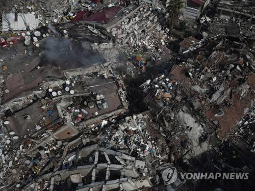 epa10452832 An aerial photo taken with a drone shows collapsed buildings in the aftermath of a powerful earthquake in the center of Kahramanmaras, southeastern Turkey, 07 February 2023. More than 4,000 people were killed and thousands more injured after a major 7.8 magnitude earthquake struck southern Turkey and northern Syria on 06 February. Authorities fear the death toll will keep climbing as rescuers look for survivors across the region. EPA/NECATI SAVAS