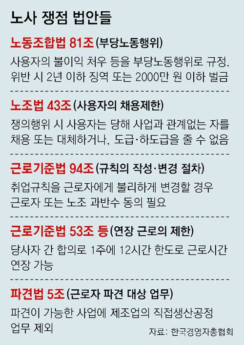 지난해 11월 취임한 김태기 중앙노동위원회 위원장도 1953년 제정된 노동법이 그간의 경제 발전 상황을 반영하지 못한다고 지적하기도 했다. 현재 노동 전문가들과 업계가 현실과 맞지 않는다고 꼽는 법으로는 노조법 81조와 43조, 근로기준법 94조와 53조, 파견법(1998년 제정) 5조 등이 있다.