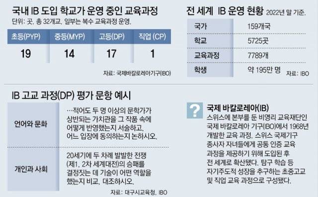 IB는 스위스에 본부를 둔 비영리 교육재단인 국제바칼로레아기구(IBO)가 1968년부터 개발해 보급한 교육 과정이다. 지난해 말 기준 전 세계 159개국에서 5725개 학교가 IB를 도입해 운영 중이다. 한국에서는 대구, 제주 일부 학교가 도입했고 경기, 부산, 충남 등 각 교육청도 도입 논의가 활발하다.》