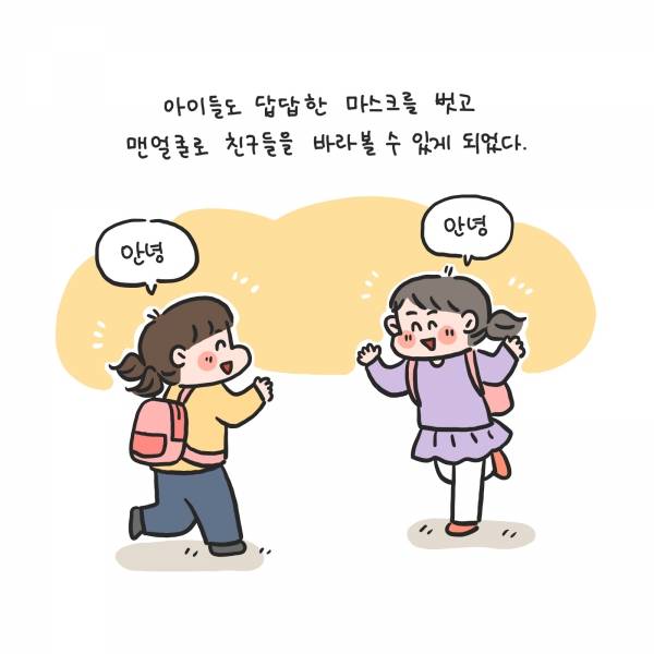 아이들도 답답한 마스크를 벗고 맨얼굴로 친구들을 바라볼 수 있게 되었다.