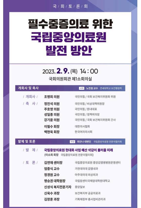 이 토론회는 국가 의료 제공을 위한 국립중앙의료원 신축·이전 병상 확보 대책을 마련하고, 현재의 국립중앙의료원 수준을 검토하고 확대 발전 방안을 제시하기 위한 자리다.