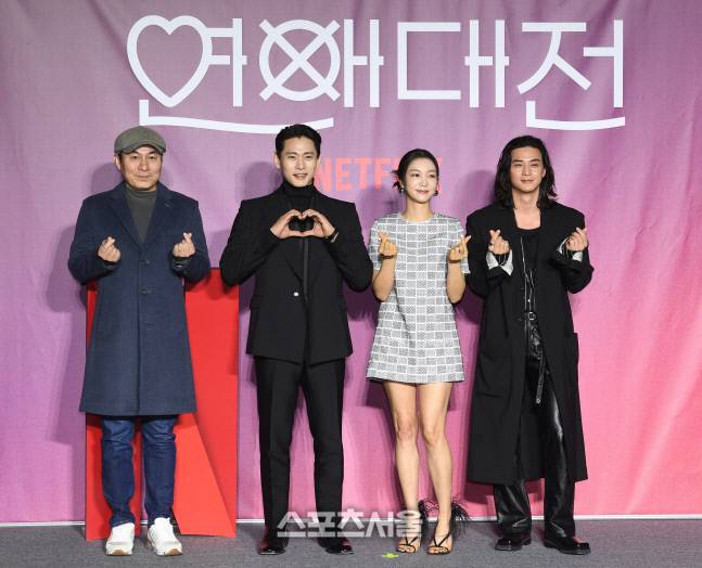 김정권 감독과 배우 유태오, 김옥빈, 김지훈(왼쪽부터)이 8일 서울 용산구 아이파크몰 CGV에서 진행된 넷플릭스 '연애대전' 제작발표회에서 취재진을 향해 포즈를 취하고 있다.