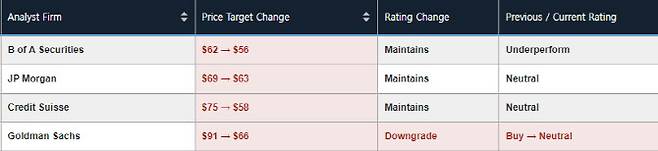 한편 타이슨 푸드에 대해 투자의견을 제시한 월가 애널리스트는 총 13명으로 이중 5명(38.5%)만 매수(비중확대 포함)의견을 유지하고 있다. 그마저 아담 새뮤얼슨의 변심으로 매수 의견 비중은 30.8%로 낮아졌다. 현재 평균 목표주가는 68.44달러로 이날 종가보다 11.5% 높다. 아담 새뮤얼슨의 종전 목표가 91달러는 월가에서 가장 높은 목표가였다.
