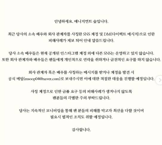 이어 "당사 소속 배우들은 현재 공개된 인스타그램 계정 외에 다른 SNS는 운영하고 있지 않다. 또한 회사 관계자와 배우들은 팬들에게 개인적으로 연락을 취하거나 금전적인 요구를 하지 않는다"고 알렸다.