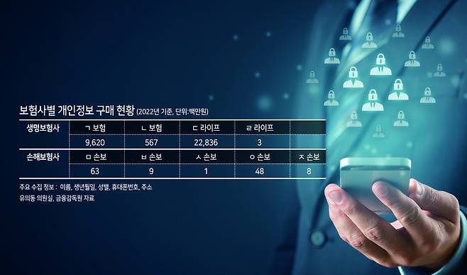 7일 유의동 국민의힘 의원실이 금융감독원으로부터 확보한 '보험사 개인정보 구매 현황'에 따르면, 지난해 생명보험사 4곳과 손해보험사 5곳이 구입한 개인정보는 총 331억5600만원어치였다.