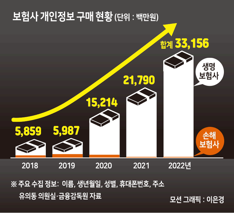 7일 유의동 국민의힘 의원실이 금융감독원으로부터 확보한 ‘보험사 개인정보 구매 현황’에 따르면, 지난해 생명보험사 4곳과 손해보험사 5곳이 구입한 개인정보는 총 331억5600만원어치였다. 대형 온라인쇼핑몰과 카드사 등 26곳이 이 보험사들에 개인정보를 팔았다. 특히 개인정보를 가장 많이 사들인 생명보험사 3곳이 구입한 개인정보만 300억원에 달했다. 5년 전에는 58억원 수준이었다. 보험사가 개인정보를 많이 사들이지만 업권을 확장하면 개인정보 거래 규모는 훨씬 늘어난다.