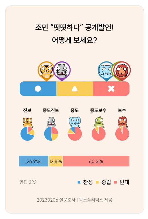 반면 보수, 중도보수, 중도 진영에서는 조 씨의 발언이 부적절했다는 반응이 대다수였습니다. 각각 95.5%, 90.8%, 75.6%가 조민 발언에 반대한다고 답했는데요. 유죄로 확인된 사실을 정당화하려는 뻔뻔한 발언이라는 반응이 대부분이죠. 보수 성향의 한 20대 남성은 “남들도 그렇게 했으니까 괜찮다는 발상 자체가 아주 위험하다”며 “스펙 위조가 유죄로 확인됐음에도 왜 떳떳한지 모르겠다”고 말했습니다.
