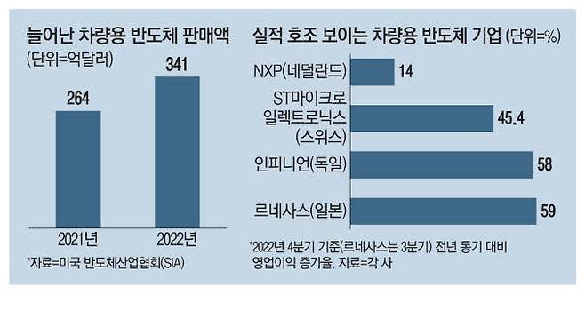 독일의 차량용 반도체 기업인 인피니언은 2023회계연도 1분기(2022년 10~12월) 매출이 39억5100만유로(약 5조3000억원)로 1년 전에 비해 25% 상승했고, 영업이익은 7억2900만유로(약 1조원)로 같은 기간 58% 급증했다. 스위스 ST마이크로일렉트로닉스는 지난해 4분기 매출이 1년 전에 비해 26% 증가한 44억2400만달러(약 5조6000억원), 영업이익은 같은 기간 45.4% 늘어난 12억4800만달러(약 1조6000억원)를 기록했다.